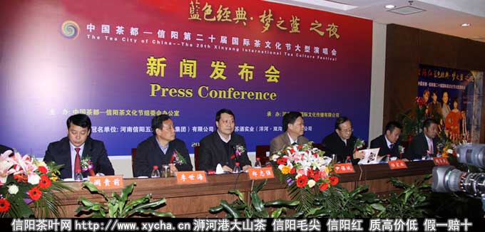 中国茶都信阳第20届国际茶文化节大型演唱会新闻发布会在信阳市豫茶园大酒店隆重举行,中共信阳市委常委,市委秘书长张继敬、信阳市人大副主任尹保斌、信阳市人民政府副市长郑志强、信阳市政协副主席任宏业、信阳市人民政府副秘书长、市茶产业办公室主任李世海、信阳五云茶叶(集团)有限公司副总经理阚贵前、江苏苏酒实业有限公司豫南片区经理阙学伍、河南世创文化传播有限公司董事长诸德海、河南世创文化传播有限公司总经理唐文华及信阳部分企业代表、新闻媒体100余人参加了新闻发布会。信阳茶叶网首席记者殷勇应邀参加了新闻发布会。